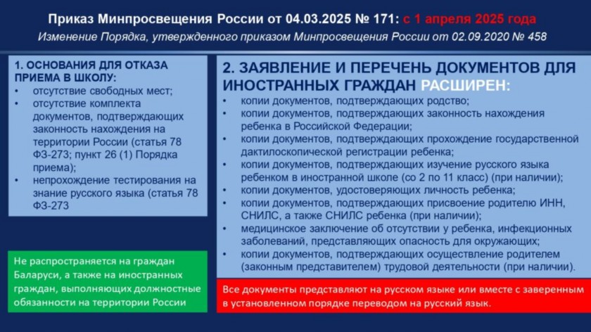 С 1 апреля 2025 года вступили в силу изменения в Порядок приема на обучение по образовательным программам начального общего, основного общего и среднего общего образования, утвержденный приказом Министерства Просвещения Российской Федерации от 02.09.2020 №458 (изменения внесены приказами Министерства Просвещения Российской Федерации от 04.04.2025 №171 и от 08.10.2025 №727), в части приема иностранных граждан и лиц без гражданства на обучение по программам начального общего, основного общего и среднего общего образования.